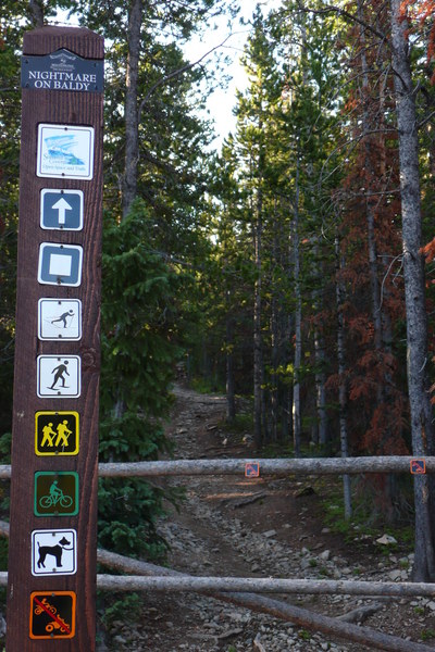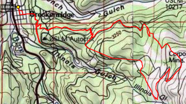 It was 39°F when I went out. It warmed up considerably while I was out, but I was still comfortable in gloves and a long sleeve shirt at the end.The run today was nice. Starting in Breckenridge (9,600'), I headed up to the high point of yesterday's run (the Sally Barber Mine, at 10,600'). Then I took a trail that was marked with the name "Nightmare On Baldy" which went up, up and then up. I topped out at 11,950'.