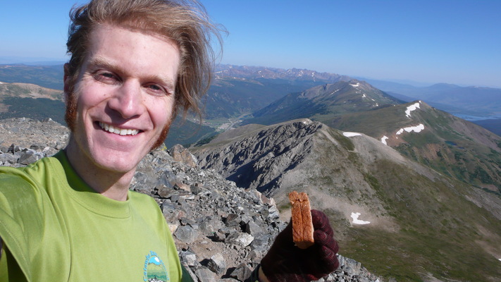 The crux of the run was the ascent to the summit of Peak 10. Most of the way is on a steep, switchbacking, four-wheel drive road. But the last few hundred yards are up a knife's edge, talus covered ridge, with about 100 yards of hard, slipery snow. At the top, I celebrated with a PB&J sandwich. Little did I know that getting down would be the real challenge.